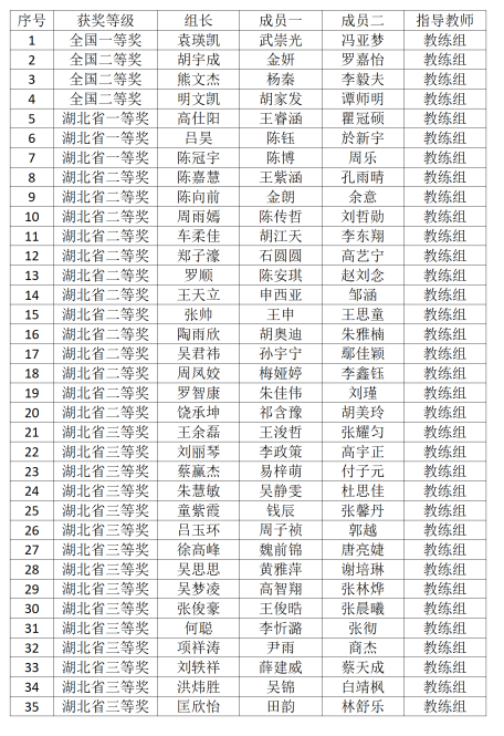 本次竞赛,学校共斩获国家级奖项4项,湖北省奖项31项。其中,全国一等奖1项,全国二等奖3项,湖北省一等奖3项,省二等奖13项,省三等奖15项。获奖质量、数量及获奖率均为我校历届最好成绩;同时,学校荣获湖北赛区优秀组织工作奖。