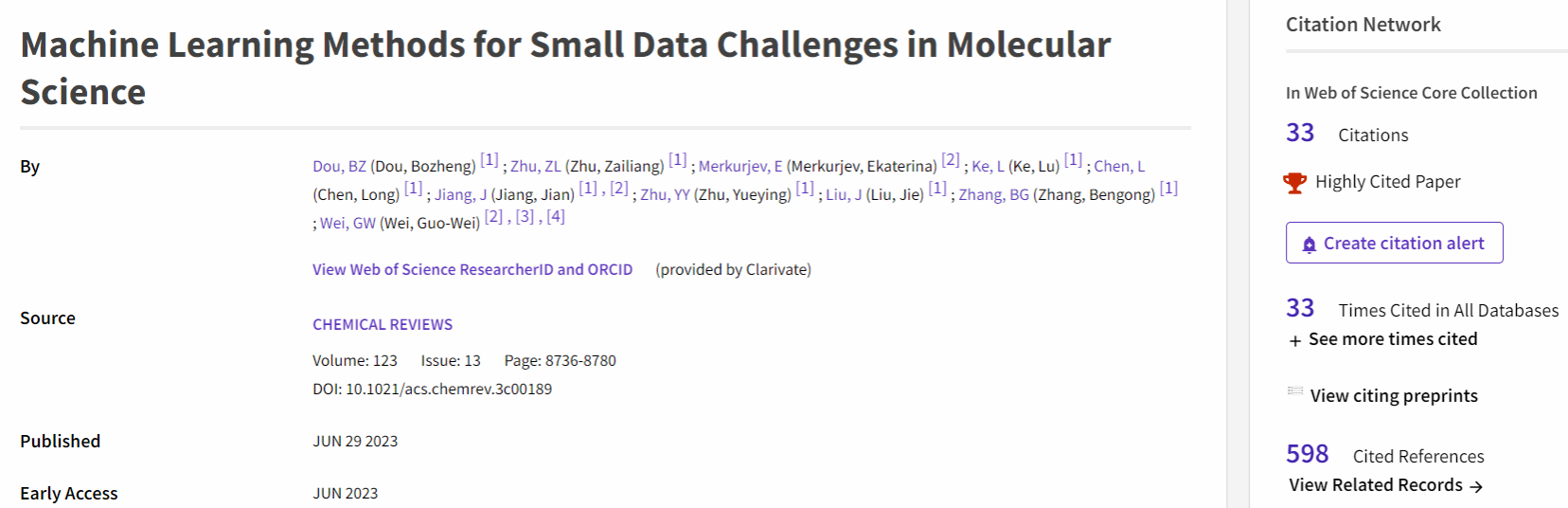最近,根据Essential Science Indicators(简称ESI)更新数据显示,我校必赢76net线路官网江健教授为第一通讯作者,其研究生窦博正为第一作者并以我校为第一单位在化学领域顶级期刊《Chemical Reviews》(影响因子62.1)上发表的论文“Machine Learning Methods for Small Data Challenges in Molecular Science”(Chem. Rev. 2023, 123, 8736−8780)成功入选化学学科领域全球前1%ESI高被引论文。该论文也是我校历史上影响因子最高的期刊论文。