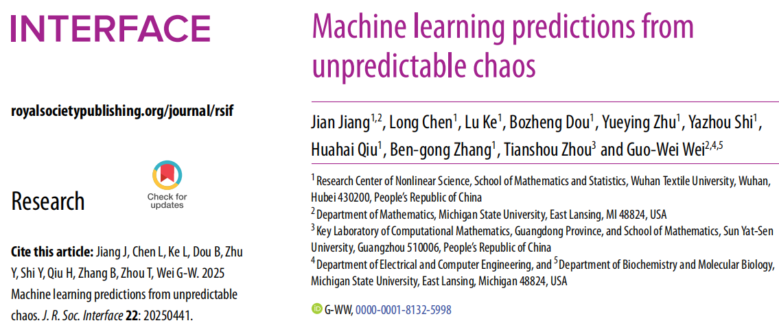 近日,我校数学与统计学院江健教授团队在药物设计方面取得重要研究进展。相关成果以“Machine learning predictions from unpredictable chaos”在物理科学与生命科学的交叉领域顶级期刊《Journal of the Royal Society Interface》上发表(J. R. Soc. Interface 22: 20250441, 2025,文章链接https://doi.org/10.1098/rsif.2025.0441)。江健为第一作者,76net必赢官网为第一单位。该工作与美国密歇根州立大学Guo-wei Wei教授团队共同完成。