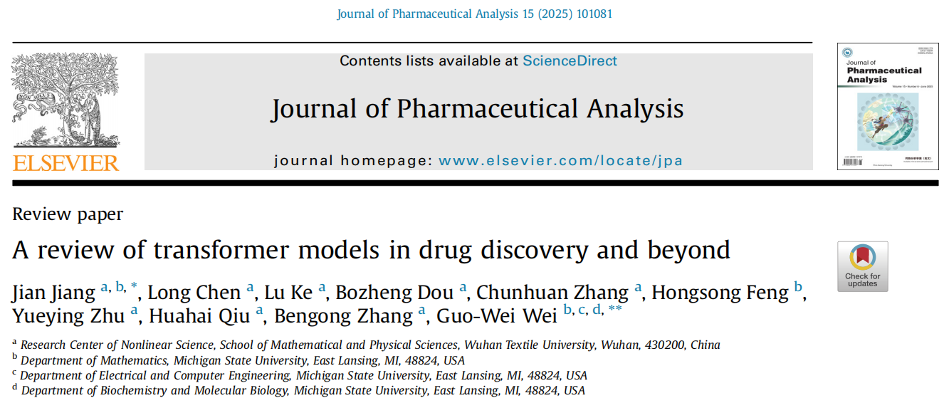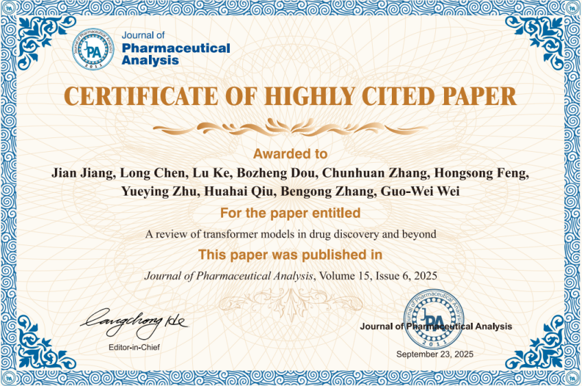 根据Essential Science Indicators(简称ESI)最新数据显示,我校数学与统计学院江健教授团队2025年6月发表在国际学术顶级期刊《Journal of Pharmaceutical Analysis》(中科院一区Top)的学术论文“A review of transformer models in drug discovery and beyond”(J. Pharm. Anal. 15, 6, 101081, 2025,文章链接https://doi.org/10.1016/j.jpha.2024.101081)成功入选药理学与毒理学领域ESI全球前0.1%热点论文。论文第一作者为江健教授,美国密歇根州立大学Guo-Wei Wei教授为通讯作者,76net必赢官网为第一通讯单位。