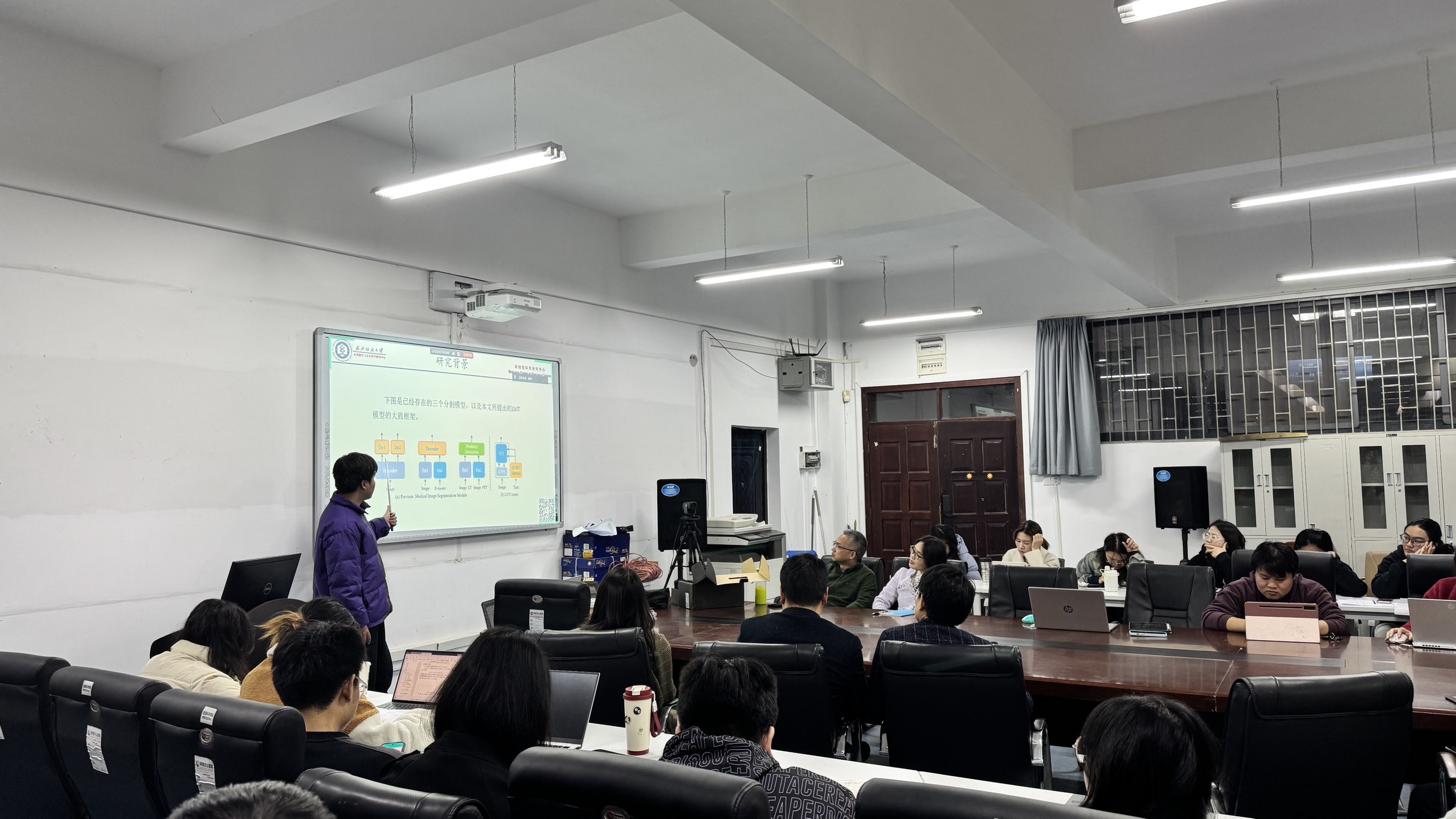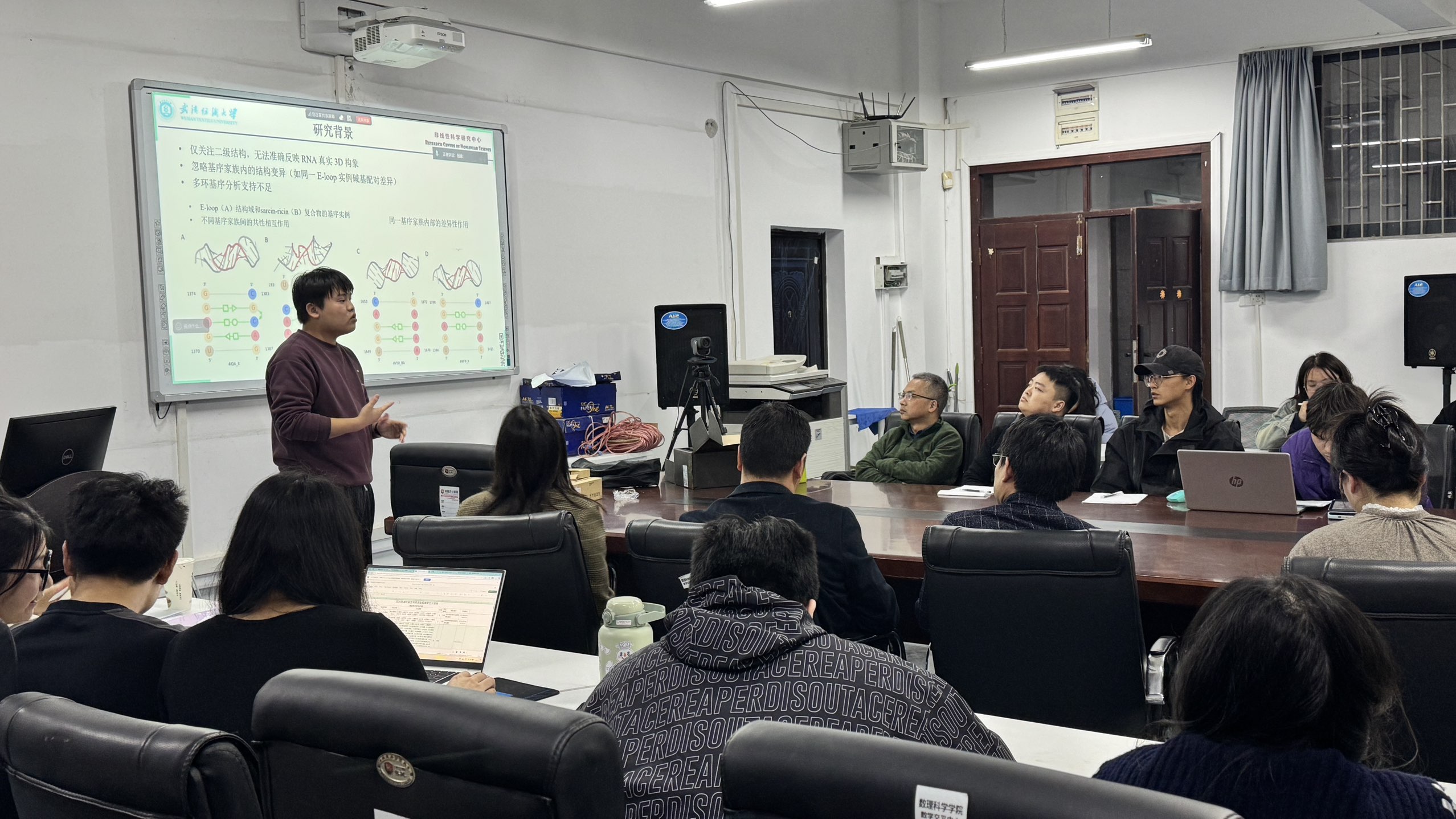 应用数学与交叉科学研究中心生物信息学团队于2025年11月19日第2次组会按期举行,小组全体成员和各位导师共同参加。在这次组会上,由两名研二学生和一名研一学生分别汇报自己的研究进展,然后老师与同学们对汇报内容进行学术探讨,并对存在的问题给出相应的指导和建议。