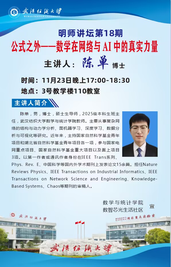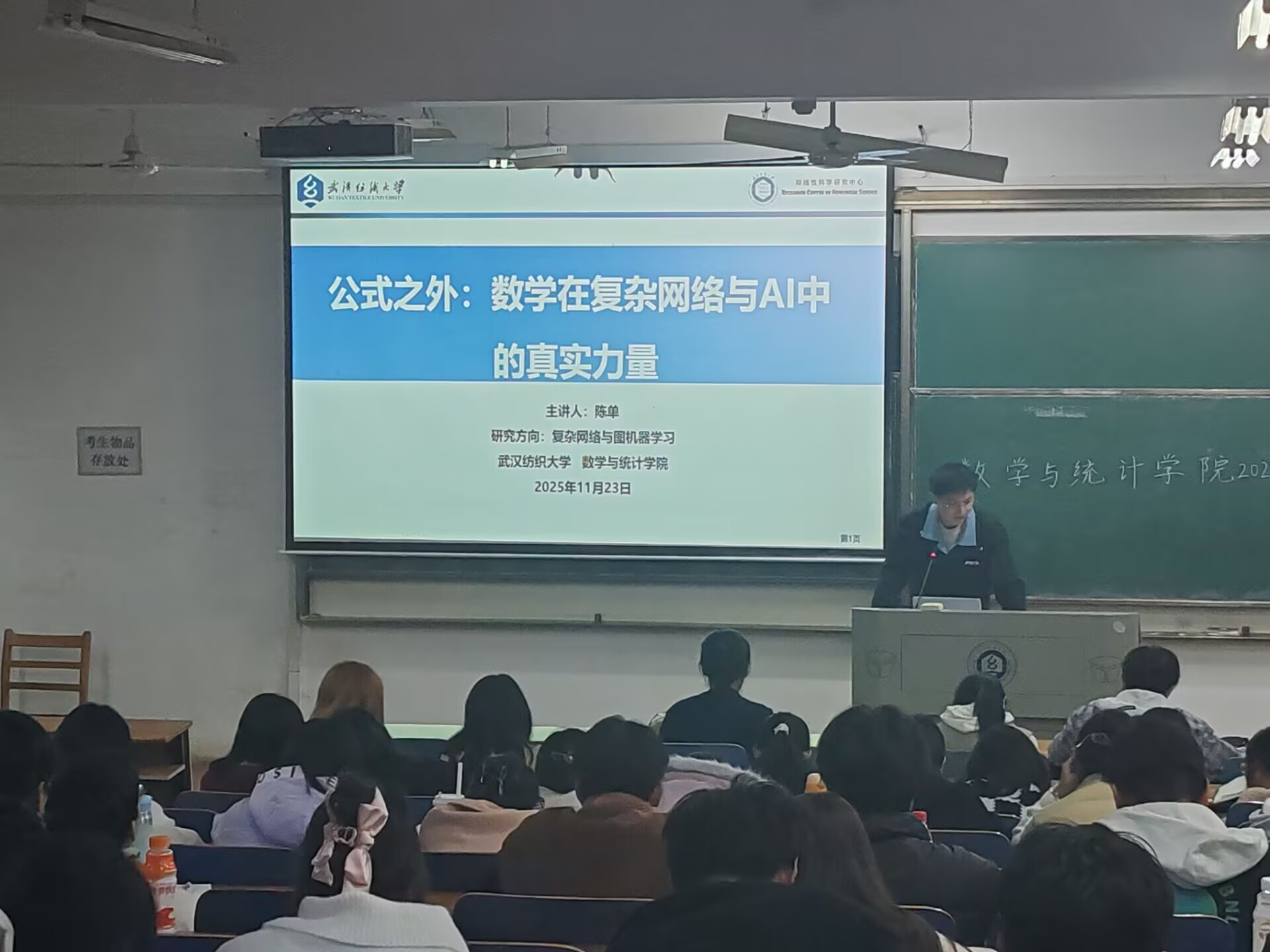 2025年11月23日,76net必赢官网数学与统计学院陈单博士以“公式之外:数学在复杂网络与AI中的真实力量”为题开展专题分享,深入剖析数学作为隐藏引擎,在复杂系统认知与人工智能发展中的关键作用,为在场听众揭开数学跨界应用的神秘面纱。